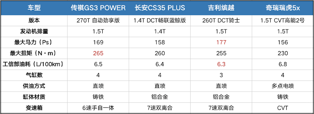 传祺GS3 POWER搭载广汽第三代1.5T发动机,最大扭矩达到265N·m,且采用直喷技术,油耗和动力性能达到较好的平衡。长安CS35 PLUS虽然排量小了一点,但整体数据并并会特别吃亏。至于奇瑞瑞虎5x所采用的1.5T发动机,采用传统的多点电喷方式,铸铁缸体,无论是动力性能和油耗等各项数据指标都是垫底水平。