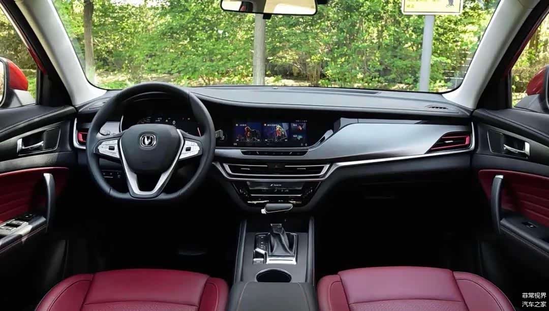 长安CS35 PLUS采用较为传统的内嵌式车机,通过飘逸的线条勾勒出年轻气息。但口味向来“清淡”的熊熊我个人觉得有点复杂了。中控台上运用了拉丝工艺的饰板,同样为了凸显年轻感。