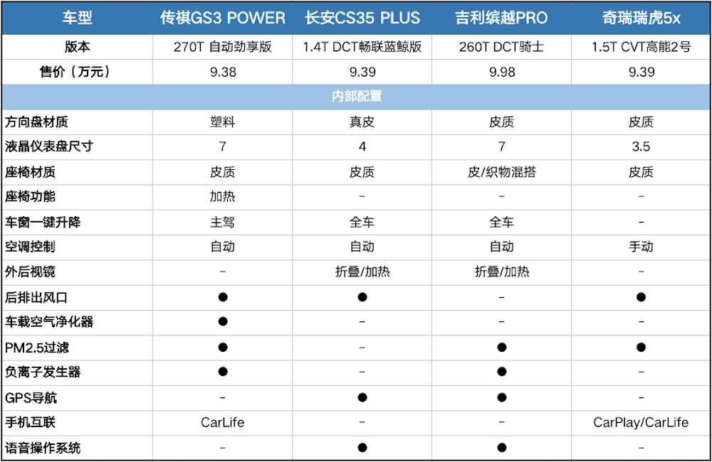 不过,它们各具特色,全力诠释了各自品牌的设计理念。传祺GS3 POWER和吉利缤越强调的是高级感,采用很多锐利的线条;长安CS35 PLUS和奇瑞瑞虎5x求“稳”,难以让人一眼动容。