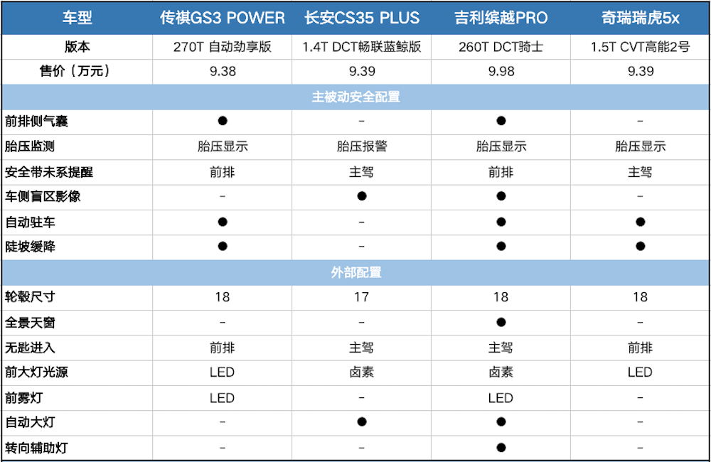 配置的对比,当然在同价位的前提下了。我们选取的版本,差价并不大,吉利缤越稍微贵了几千元而已。在主被动安全方面,传祺GS3 POWER和吉利缤瑞相对周到,起码多了前排侧气囊,主动型的胎压监测。