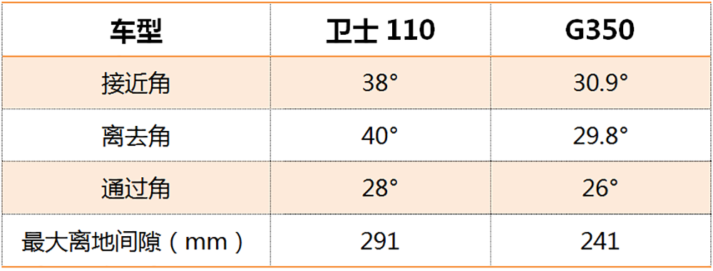 我相信这是大家最关心的话题,卫士和G350到底谁更硬?从下表中可以看出,路虎卫士在所有硬指标方面都优于奔驰G350。而且,卫士配备的空气悬挂可调行程为185mm,最高的涉水模式可以在基础高度上再抬升145mm,公路上可以基于基础高度下降40mm——虽然这个功能只是为了方便上下车。
