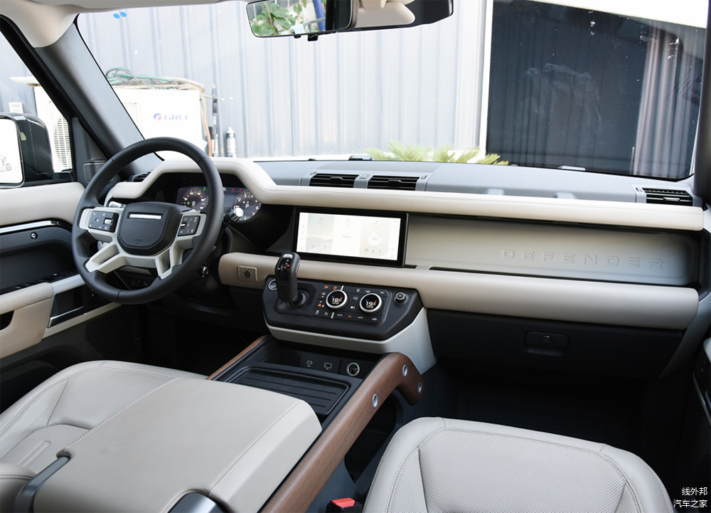 路虎卫士车内简洁不失豪华,又带点粗犷,没有多余修饰,在此基础上加入了皮质包裹和外露铆钉。加上副驾前方一块外露的镁铝合金饰板,看着就给人力量感。