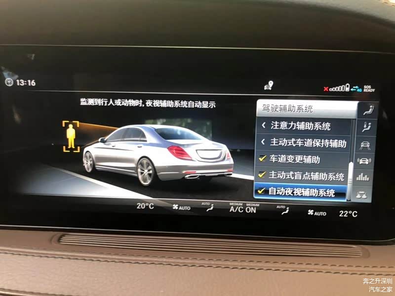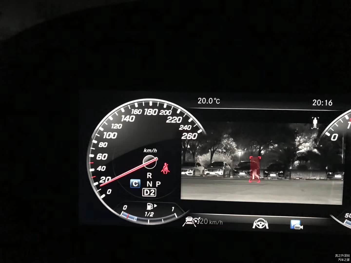 夜视摄像头可监测车辆前方 300 米以内的路况,确保在光线不足的环境下行车更加安全。夜视系统能够检测到诸如行人、大型动物等移动障碍物,并在中央触摸屏中将其突显出来。