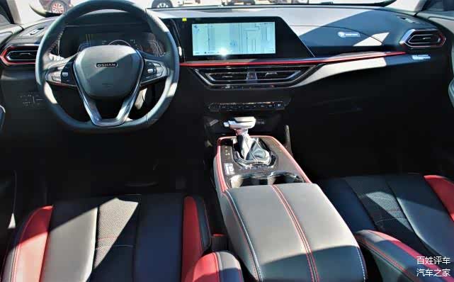进入车内,长安欧尚X5采用了立体超感座舱理念和红黑双色混搭设计,细节处加入了镀铬元素、仿碳纤维饰板进行点缀,进一步营造整车的运动氛围。10.25英寸的大尺寸中控屏幕更加偏向于驾驶员一侧,搭配7英寸的液晶仪表,科技感十足。