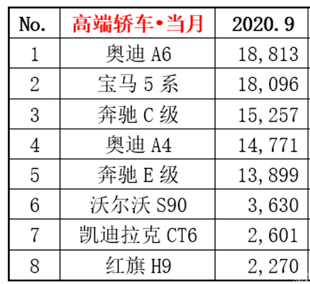整体销量上9月份红旗在豪华品牌中领先于沃尔沃和雷克萨斯,而且其旗舰轿车红旗H9今年8月上市以来也取得了不错的成绩,9月红旗H9销量2270台,仅次于凯迪拉克CT6,在由合资品牌垄断的高端轿车市场打出了一块领地。