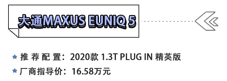 与比亚迪宋MAX DM车型以及吉利嘉际新能源不同,大通MAXUS EUNIQ 5虽然在造型上和传统的MPV车型更加的接近,但是依然是紧凑型MPV的定位,因此后排并未采用侧滑门,并且在车型阵容中,大通MAXUS EUNIQ 5有五座、六座和七座不同的座椅布局选择,还有插电混动版和纯电动版车型可供选择,其中插电混动版车型中入门的1.3T PLUG IN精英版售价16.58万元。