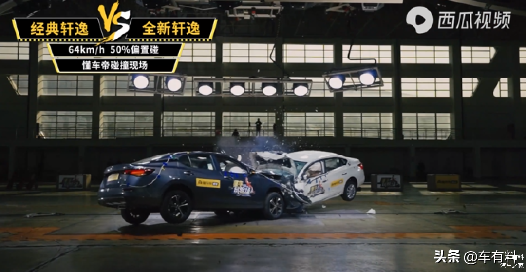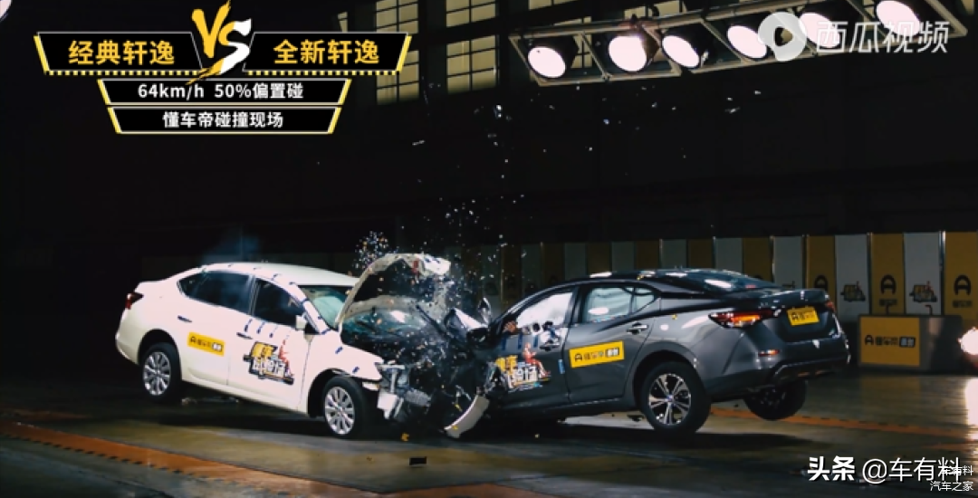 11月18日,字节跳动旗下汽车媒体平台“懂车帝”发布了新老轩逸正面对撞的碰撞试验视频,该媒体采用双车64公里/小时的50%偏置对撞方式。也就是说,在碰撞试验过程中,全新轩逸和经典轩逸均以64公里/小时的速度、50%的重叠率(驾驶员侧)完成正面对撞,最后根据车体变形程度及假人伤害数据进行评价。