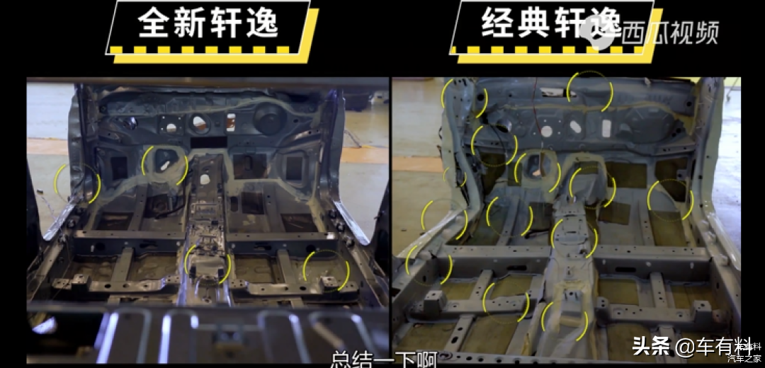 对车辆完成拆解后,经典轩逸的结构情况也更为明显。全新轩逸的底盘结构几乎没有太大的变形;而经典轩逸的中央通道出现扭曲变形,驾驶侧底盘变形隆起,左侧前后门槛梁部位也有变形。
