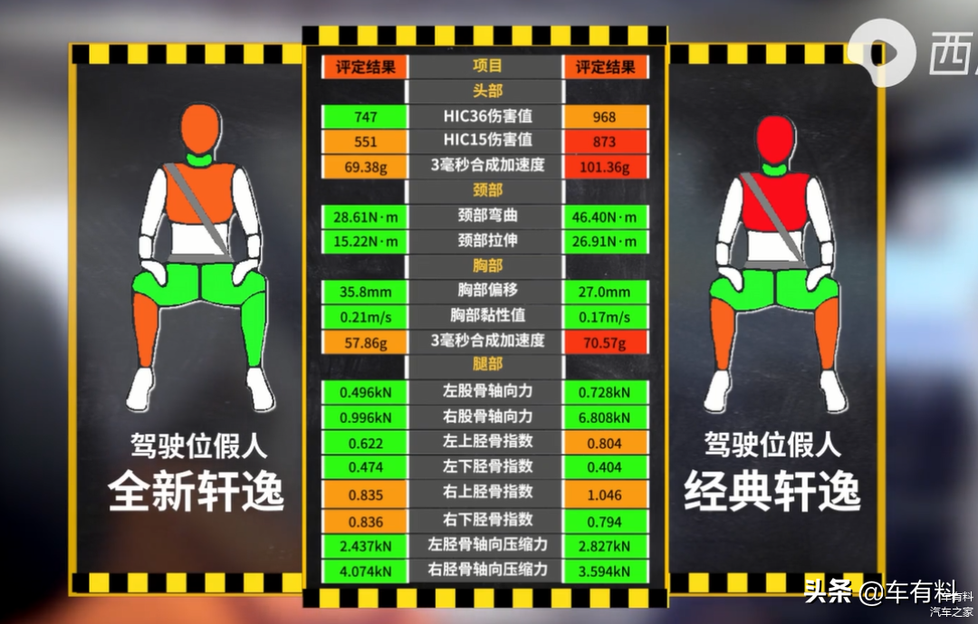 在假人伤害数值上,全新轩逸有5个项目为M;而经典轩逸有3个项目为M,3个项目为P,其中在头部、胸部位置的伤害值较高。