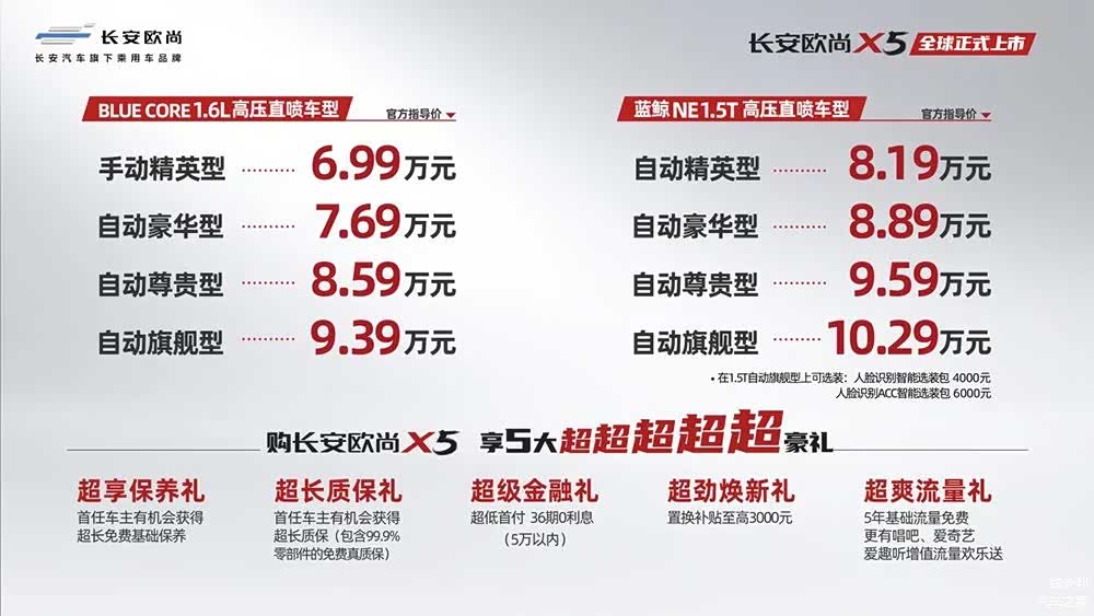 11月29日, 长安欧尚X5(图片 | 参数 | 询价)正式上市,共8款车型,官方指导价为6.99万-10.29万。从车型售价来看,欧尚X5除顶配以外,其余7款车型售价均在10万以内。有着十大全系标配,价格十分具有竞争力。此次上市,欧尚X5还推出了超享保养礼、超长质保礼等五大超豪礼,让购车用车变得更加轻松省心。