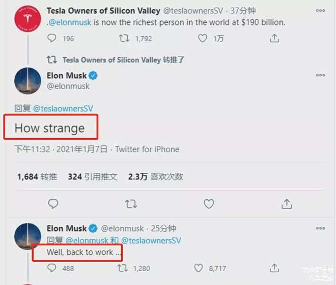 对于自己成为新的全球首富,马斯克不以为然,发推特表示:“真奇怪,回去工作吧……”
