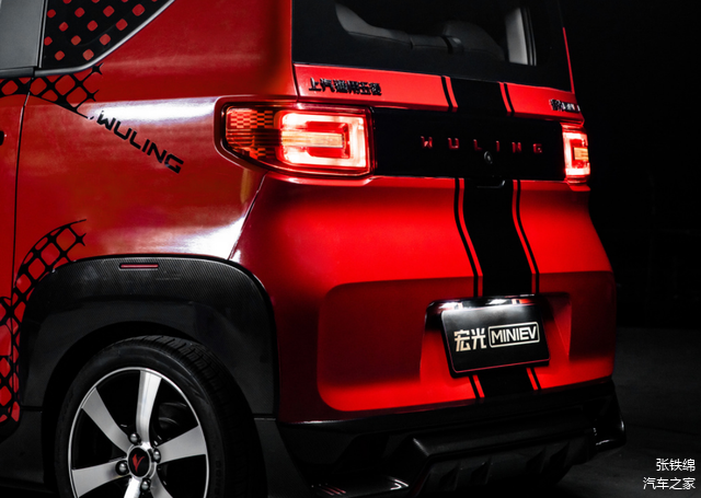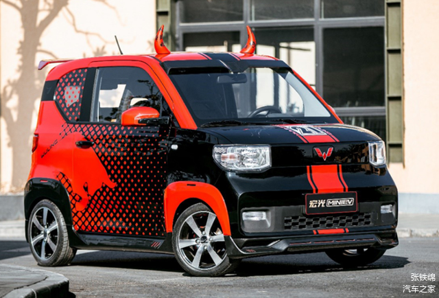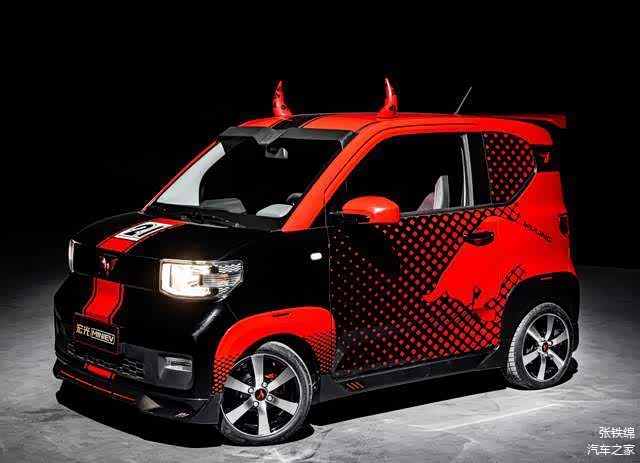 红黑撞色外观涂装,赛车式的拉花装饰,更大尺寸的运动轮毂,车身底部的保卫套件,车顶带牛角+大尾翼,这辆新版的宏光MINI可以说是最拉风的小车了。