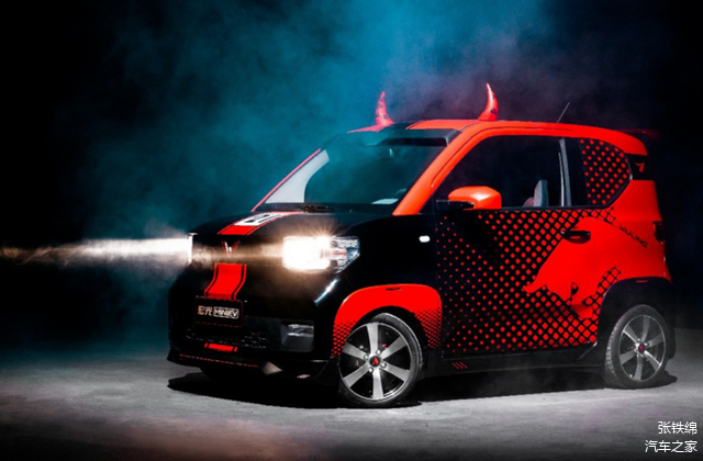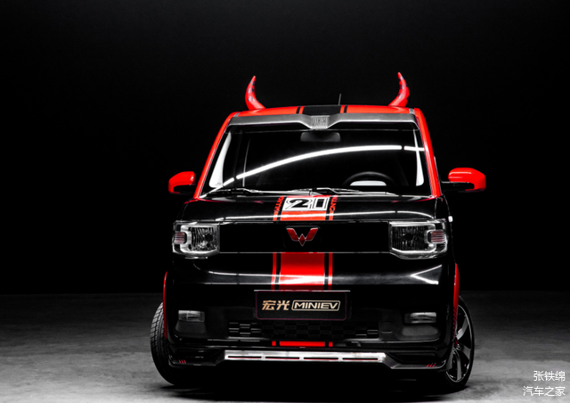这辆牛年纪念版宏光MINI使用了红黑撞色的外观涂装,车头部分主要是以黑色为主,在前杠和机盖中间位置带有条形红色装饰,类似赛车的风格。在车顶靠前的位置上带有两个牛角装饰,另外在前杠底部还增加了包围套件。