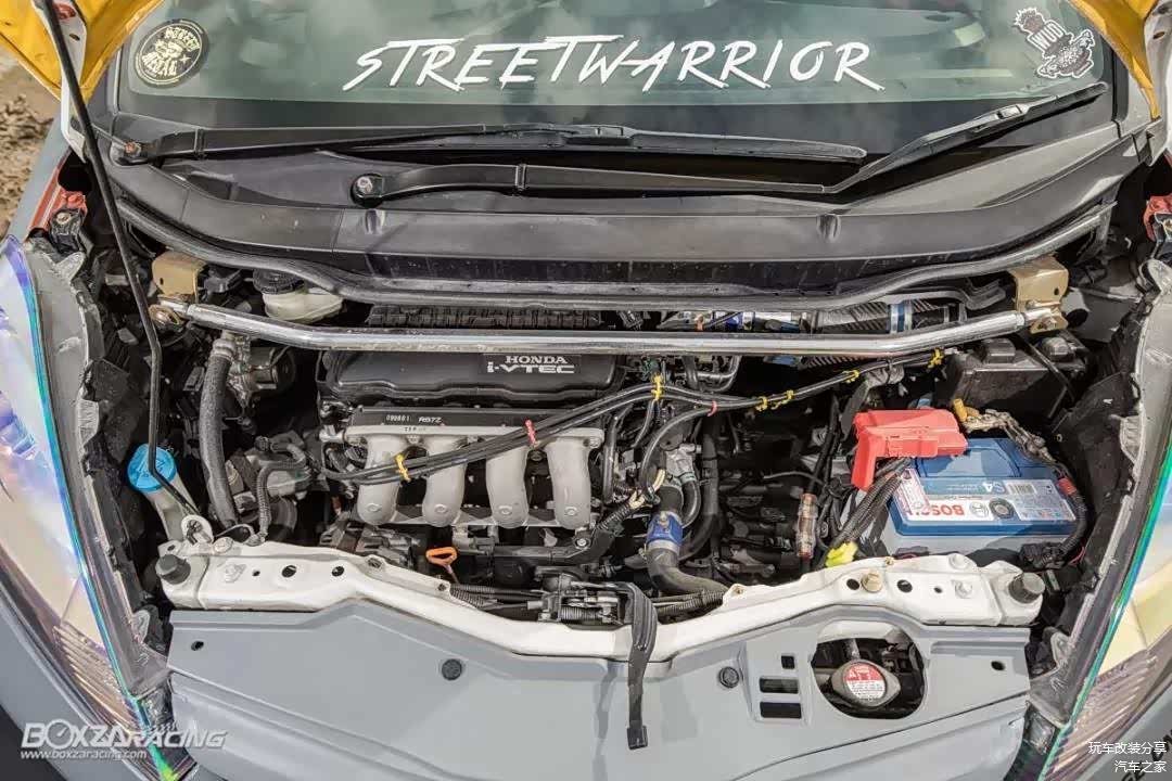 看到了如此夸张的外观,对于此车的性能大家一定遐想连篇,打开发动机舱,大家可能会感到失望。这台飞度的改装更多的是外观竞技化,动力方面基本维持原厂设定,只是使用了外挂电脑提升些许马力。