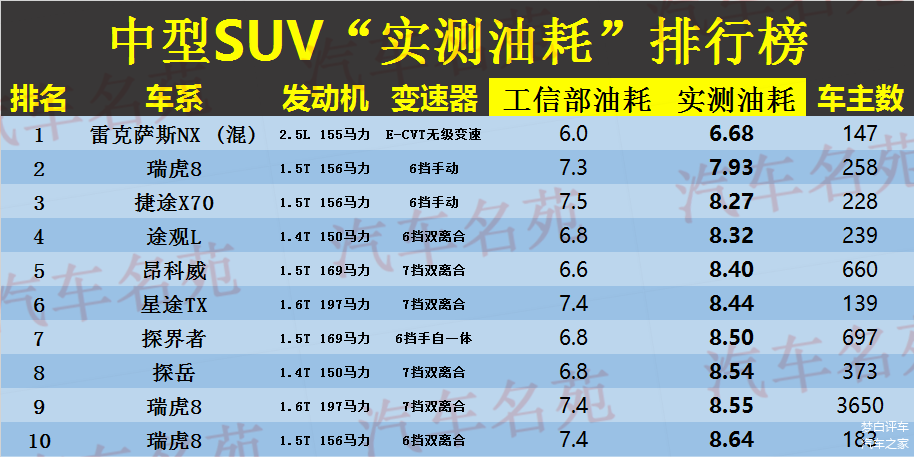 雪佛兰探界者和大众探岳也是入榜前十,两款中型SUV也是消费者比较认可的合资车型,它们的工信部油耗都为6.8L,实测油耗在8.5L左右,整体油耗表现还是挺令人满意的。另外,奇瑞瑞虎8的1.6T车型也是表现不错,它的工信部油耗是7.4个油,实测油耗在8.55L左右,这对于一款国产自动挡车型来说,已经是非常不错了。