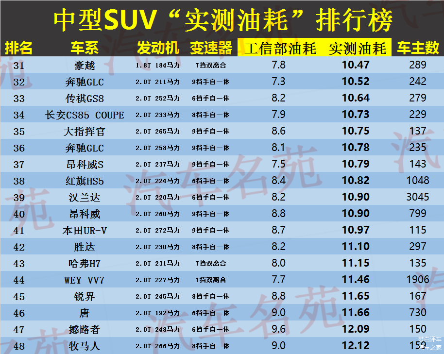 最后,吉利豪越、奔驰GLC、昂科威S、红旗HS5以及丰田汉兰达等高品质车型,它们的大功率车型都排名靠后,实测的百公里油耗在10.4L之上,其中汉兰达的表现比较令人意外,它搭载的是丰田2.0T发动机,整体性能表现比较领先,但它的实测油耗却比工信部油耗高出了2.7个油。而排名靠后的几款中型SUV,它们的实测油耗都超过了11L,整体油耗表现都非常一般,其中包含很多国产SUV。对于最新中型SUV“实测油耗”排名,瑞虎8力压探岳,冠道仅9L,大家怎么说?