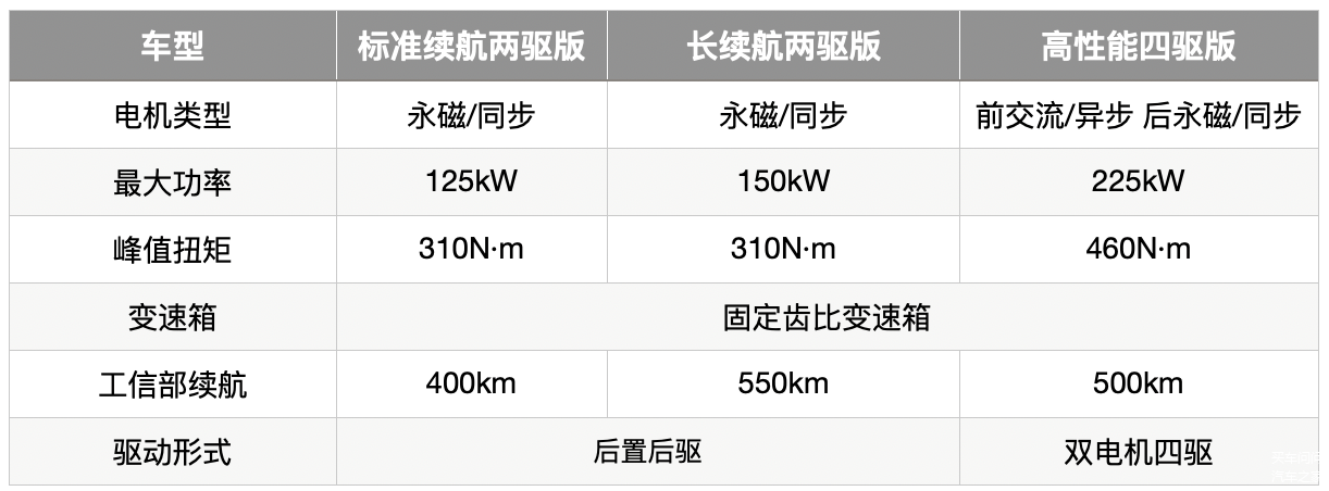 电机的性能参数方面,标准续航两驱版电机最大功率为125kW、峰值扭矩310N·m;长续航两驱版最大功率为150kW、峰值扭矩同样为310N·m;高性能四驱版的综合最大功率为225kW、峰值扭矩460N·m。此外标准续航版和长续航版均采用了后置后驱的布局,而高性能版为前后双电机四轮驱动。