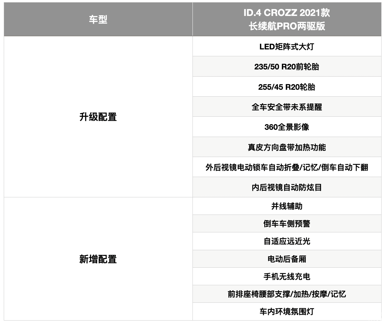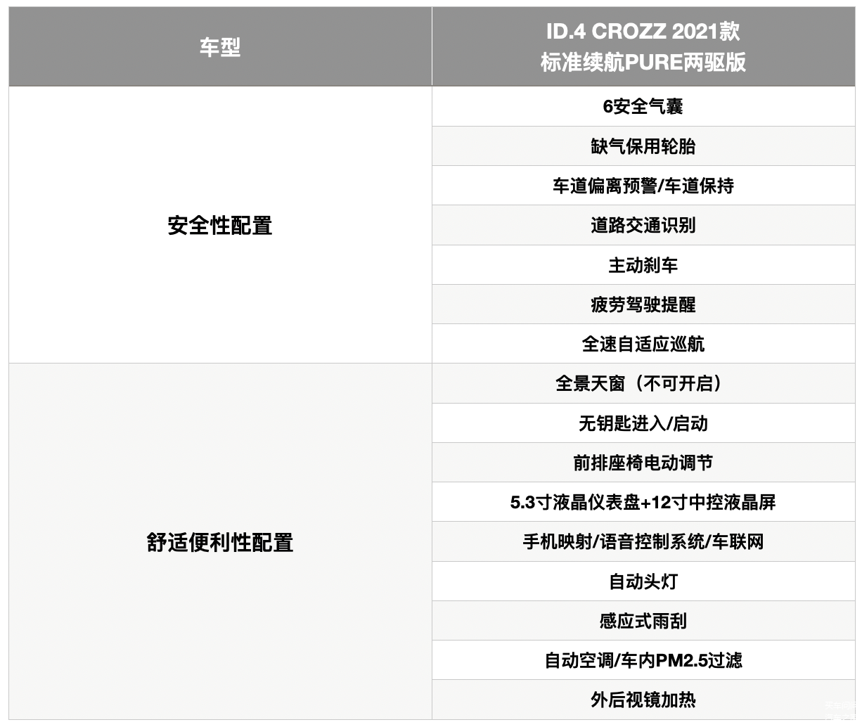 虽然是入门版车型,不过从ID.4 CROZZ标准续航PURE两驱版就可以看出它的全系标配力度非常到位,首先是各项主、被动安全配置十分齐全,车道偏离预警/车道保持、主动刹车和全速自适应巡航和疲劳驾驶提示功能的配备对于那些首购型的消费者来说非常实用,同时无钥匙启动/进入、5.3英寸液晶仪表+12英寸中控屏、电动座椅调节、自动空调等常规的舒适便利性配置也予以了标配,如果消费者对于续航没有太高的要求,放心选择入门版本即可。