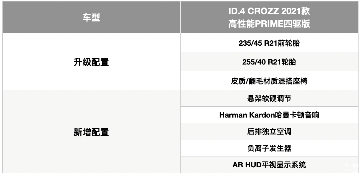 顶配版本的高性能PRIME四驱版除了动力和驱动方式的变化,指导价格也达到了近28万元,作为ID.4 CROZZ车系的形象担当,它比长续航PRO两驱版多出了大众品牌颇受好评的DCC 智能动态控制系统,前后轮胎规格升级到了21英寸,并在车内增配大量享受型装备,譬如哈曼卡顿音响、三区空调和负离子空气净化功能,如果购车者是性能发烧友,多花4万元不仅驾驶感受更丰富,各个维度的配置也实现了一步到位。