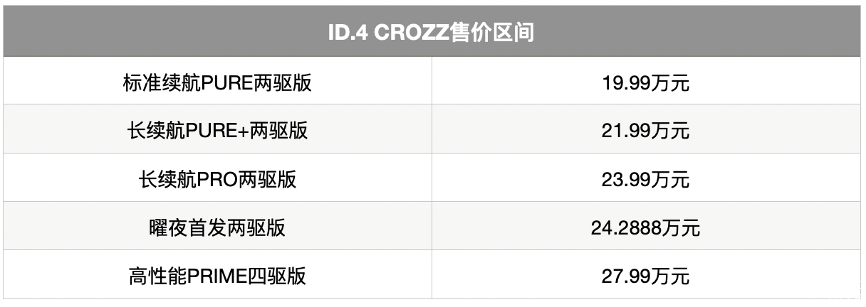 在电动化的大趋势下,许多传统巨头也开始发力新能源领域,ID.4 CROZZ作为一汽-大众MEB平台下首款纯电作品,已在今年年初正式公布补贴后售价区间为19.99-27.99万元,为了提升吸引力,官方还推出了两年六折、三年五折的保值政策,可谓来势汹汹,那么对于有意购买合资纯电动车型的消费者而言,ID.4 CROZZ哪一款最值得购买呢?