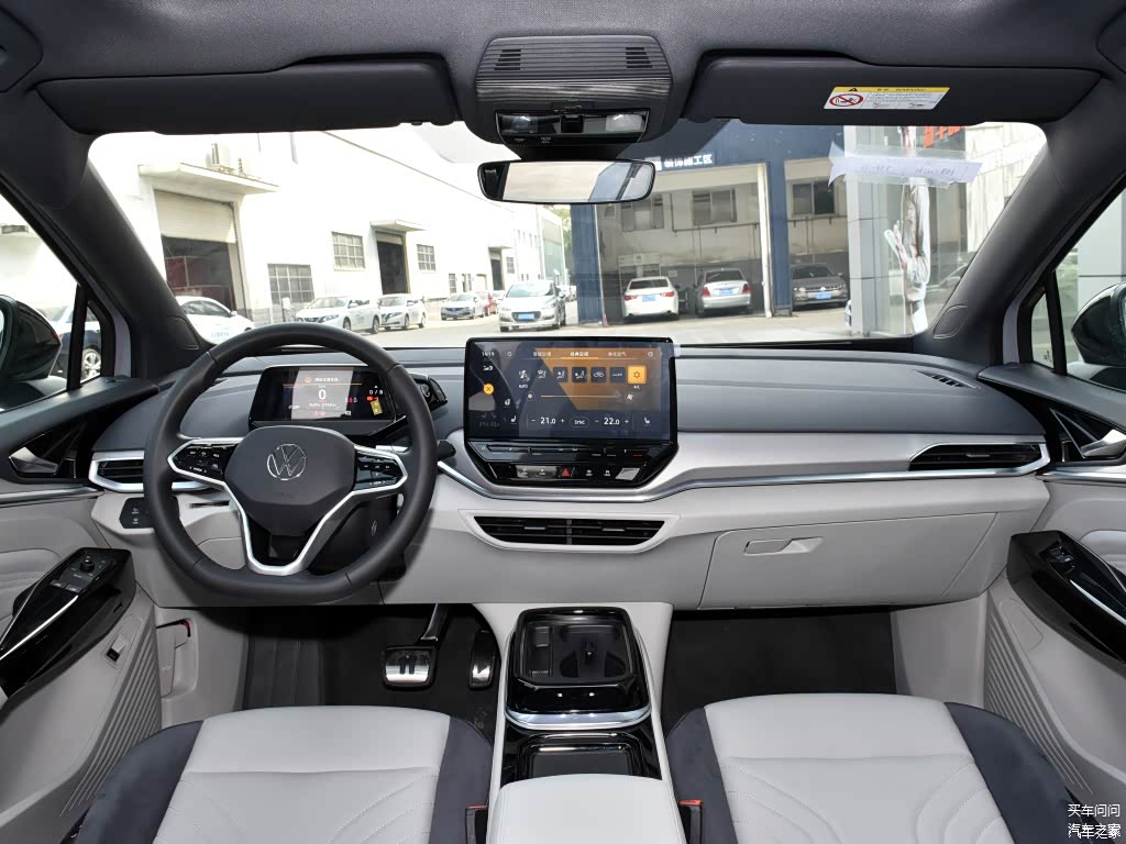 ID.4 CROZZ内饰部分以简约、干净的设计风格示人,中控台布局与材质搭配都非常强调轻盈感和空间感,电子挡杆与5.3英寸全液晶仪表连为一体,12英寸悬浮式中控屏幕则内置了大众最新智联交互系统,当然,在带来科技感的同时,ID.4 CROZZ也保留了部分实体按键,便于行车过程中的功能操作。