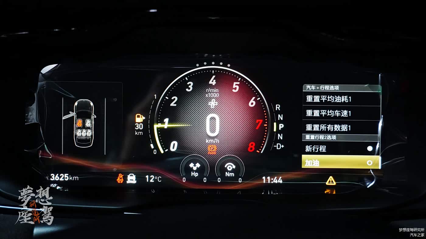 左侧行驶中显示前后动力分配比,中间是转速和时速,时速的下方是动力输出(左边马力,右边扭矩)值,右侧是多功能区域,显示行车、导航还有多媒体信息。