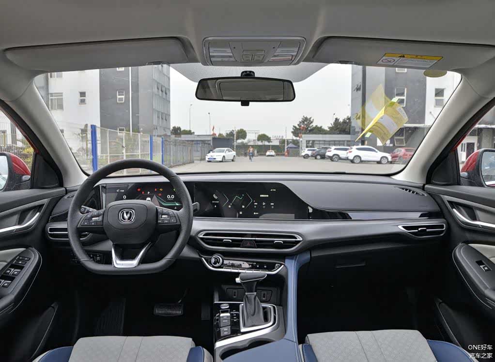 逸动PLUS的车内非常简约,而且双联屏的设计也很具有科技感。像三辐式多功能方向盘也是采用了真皮包裹,手感和握感都很不错,很能激起人的驾驶欲望,整体内饰的氛围效果比较让人满意。
