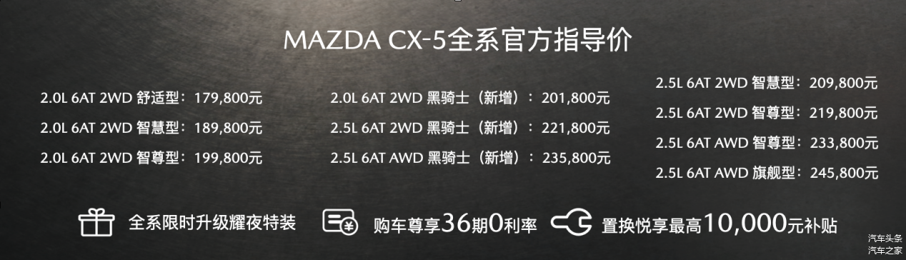 4月17日,长安马自达全新MAZDA CX-5(图片 | 参数 | 询价) “黑骑士”正式上市。新车共推出3款车型,售价区间为20.18万—23.58万元。针对MAZDA CX-5全系车型,长安马自达同步推出全新“耀夜特装”限时升级礼遇。与此同时,长安马自达首款新能源汽车MAZDA CX-30 EV借助本次发布会完成了中国市场首秀。