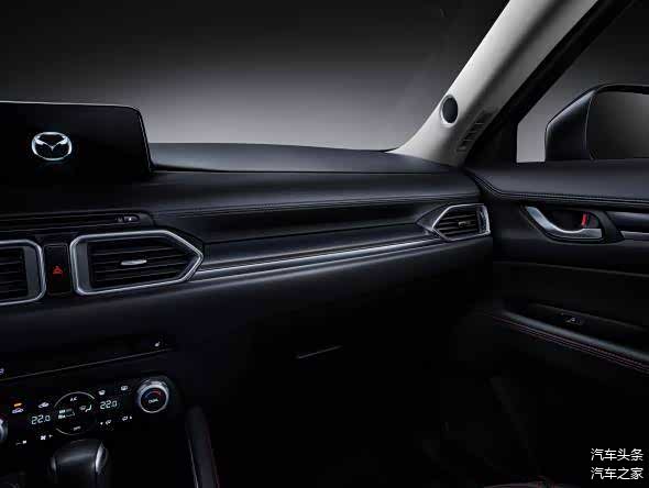 内饰方面,全新MAZDA CX-5黑骑士在简约豪华的内饰风格基础上,加入炭黑蜂巢饰板、精致红色缝线等限定元素,并全系标配无线充电功能,呈现与之前完全不同的气质。