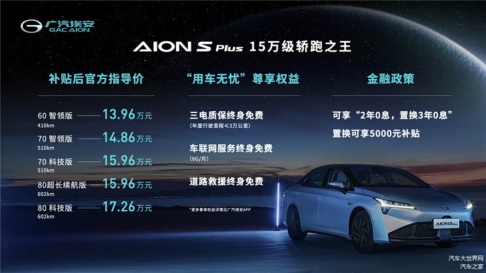 6月23日,广汽埃安AION S Plus正式上市,共推出5款车型,补贴后售价区间13.96-17.26万元。作为 AION S(图片 | 参数 | 询价)的升级版车型,新车在续航里程上有所提升,NEDC续航里程分别为410km、510km及602km。