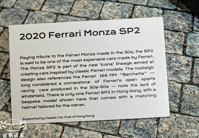 香港人文购物艺术馆停着一辆 法拉利Monza SP2(图片 | 参数 | 询价),这是香港唯一的一辆。这款车和普通车有所区别,一般的车都有挡风玻璃和顶篷,即便是敞篷车也有可收缩的顶篷,但是这辆车什么都没有,因为造型非常的另类,所以让不少人驻足欣赏。