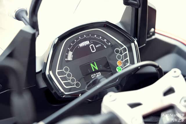 TIGER SPORT 660配备TFT彩色液晶仪表,仪表造型类似六边盾形,分为上下两个液晶屏,上方为车速、发动机转速、油量等信息,下方显示挡位及设置信息,屏幕左右两边是各种行车信号灯。