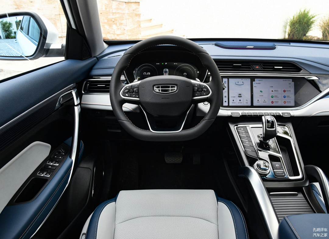 车内设计也基本套用了吉利博越,中控台面还是传统风格,并没有吸收借鉴全新吉利星越L更炫酷的全面屏设计,只是提供了主流全液晶仪表搭配镶嵌导航大屏幕。当然现在看起来这种内饰并不算过时,更何况这次吉利设计师团队很聪明提供了拼色皮革面料包裹,让内饰看起来更加年轻运动。