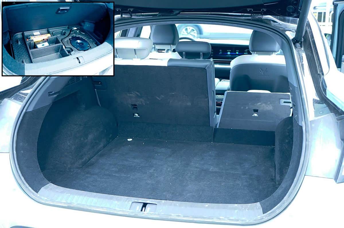 掀背式尾门拥有很大的开口,进出大件物品方便很多。尾厢两侧轮拱凸起位置较低,对横向空间影响算比较小的,加上不错的纵深和高度,常规状态下可提供560L的容积,相当出色,4个人长途旅行也足够。后排座椅支持4:6放倒,平整度一般,但最大容积可提升至1300L,在轿车中是非常大的了。地板下方配备有低音喇叭和充气泵、补胎液等应急工具,未配置备胎。