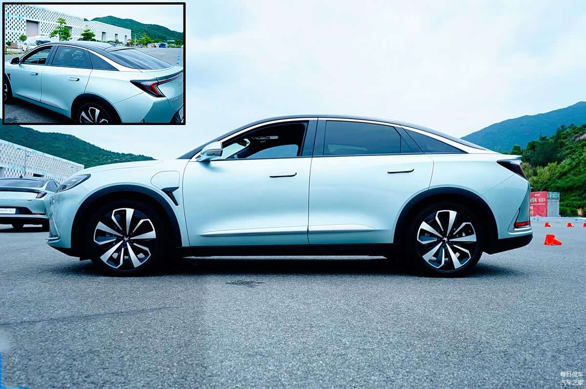 侧面造型体现出浓郁的跨界味道,采用大溜背式车顶、掀背式尾门,最有趣的是座舱与车身采用了分离式布局,整个座舱都是黑色涂装,并利用粗壮的环绕式镀铬饰条形成闭环,仿佛座舱部分是后加装上去的。细节方面,侧裙增加了银色饰条提升立体感,分段式腰线若隐若现显得很柔和,但车尾的线条却是方正刚劲,两种风格融合的也很自然。