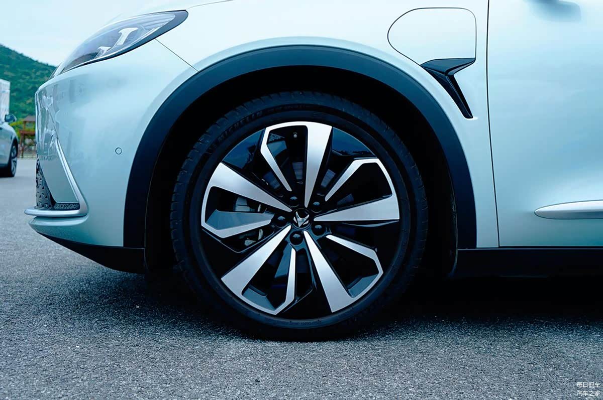 提供19、20、21英寸三种轮圈,其中21英寸仅在华为HI版上配备。图中是20英寸的五辐式双色半封闭轮圈,造型新颖并有一定的空气动力学效果。轮胎规格是245/45 R20,宽度足够,匹配的是米其林PILOT SPORT 4 SUV系列产品,可以提供足够的抓地力,对于释放强劲动力和制动都很有帮助。