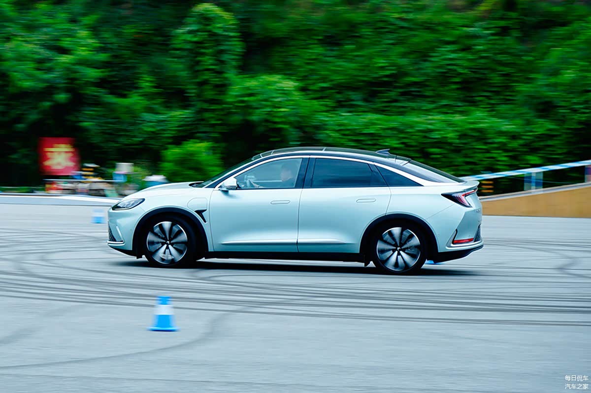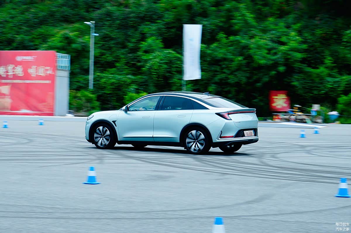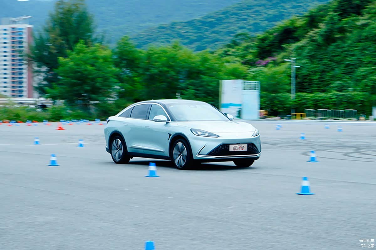 绕桩测试中,较短的前悬让车头拥有精准的指向性,方向盘的分量并不重,但转向时对于车轮位置的感知很清晰,能够让车头贴着桩桶划过,把进行路线尽量拉直。连续变线中,悬挂的侧向支撑比较到位,再加电动车重心较低,车身重心转移的幅度并不大,整体平稳性值得肯定。不过,在变线中我们发现,双电机输出对于油门十分敏感,像燃油车那样在变线中稍微顶住油门控制车速比较困难,往往一点油门扭力瞬间释放,车身会强烈外甩,反而不易掌控,因此在过程中最好不要再碰油门,这点与驾驶燃油车截然不同。