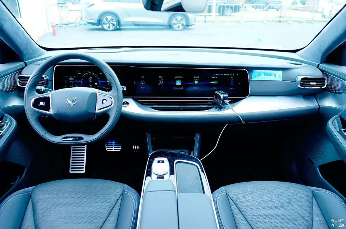 车厢内部,采用了当下电动车较为流行的大屏幕交互和简约化布局,车厢的空间感很出色,前排腿部很开阔,储物空间也较为丰富。中控台上的大连屏有明显的弯折,左边较高部分是12.3英寸全液晶仪表,而右边又长又细的是20.3英寸中控屏,两块屏幕总长度为970mm,显得很大气。中控台的造型很立体,上下沿都有凸起,两侧出风口也是凸起,有种将屏幕嵌入其中的感觉。车厢整体的用料也不错,大部分都采用了软性材质覆盖,局部还有翻毛皮装饰,档次感也是有保证的。