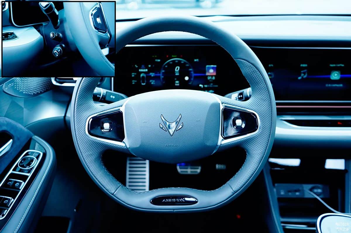 双辐式多功能方向盘采用真皮包裹(入门车型为仿皮),皮质柔软,握径和直径都很合适,两侧皮质用打孔提升手感。横辐上的多功能键采用平面化布局,中央有银色滚轮,看上去干净整洁,两侧按键主要控制屏幕显示和多媒体,驾驶辅助系统拨杆出现在方向盘左后下方,全系标配达到L2级的辅助系统。