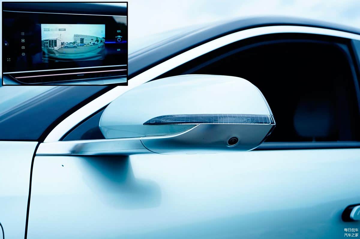 外后视镜采用银色底座+车身同色外壳组合,造型扁平有利于降低风阻。外壳集成LED侧转灯,底座上的侧置摄像头融合度也非常高,除入门车型(倒车影像)外都支持540°全景影像(含透明底盘)。外后视镜标配电动调节、折叠、记忆、加热、倒车自动下翻和锁车自动折叠功能,非常完善。