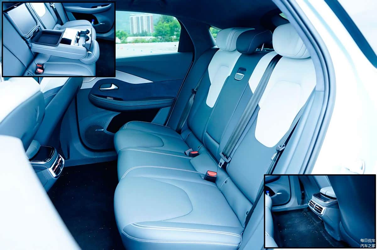 后排座椅皮面与前排相同,但坐垫的填充物更加厚实,感觉更软更舒适。坐垫和靠背间的角度合理,坐垫还有加长处理提供足够的支撑性,靠背相对比较平整,好在头枕有侧向支撑,在过弯时能起到固定身体的作用。空间方面,侃哥身高172cm,腿部空间三拳有余,可以轻松翘起二郎腿,头部有一拳略多,横向空间也很充裕,完全平整的地板对于中间乘客脚部活动没有任何影响,可以说非常出色了。后排提供地台式空调出风口、两个USB接口、带水杯架和储物格的翻折扶手,比较齐全。