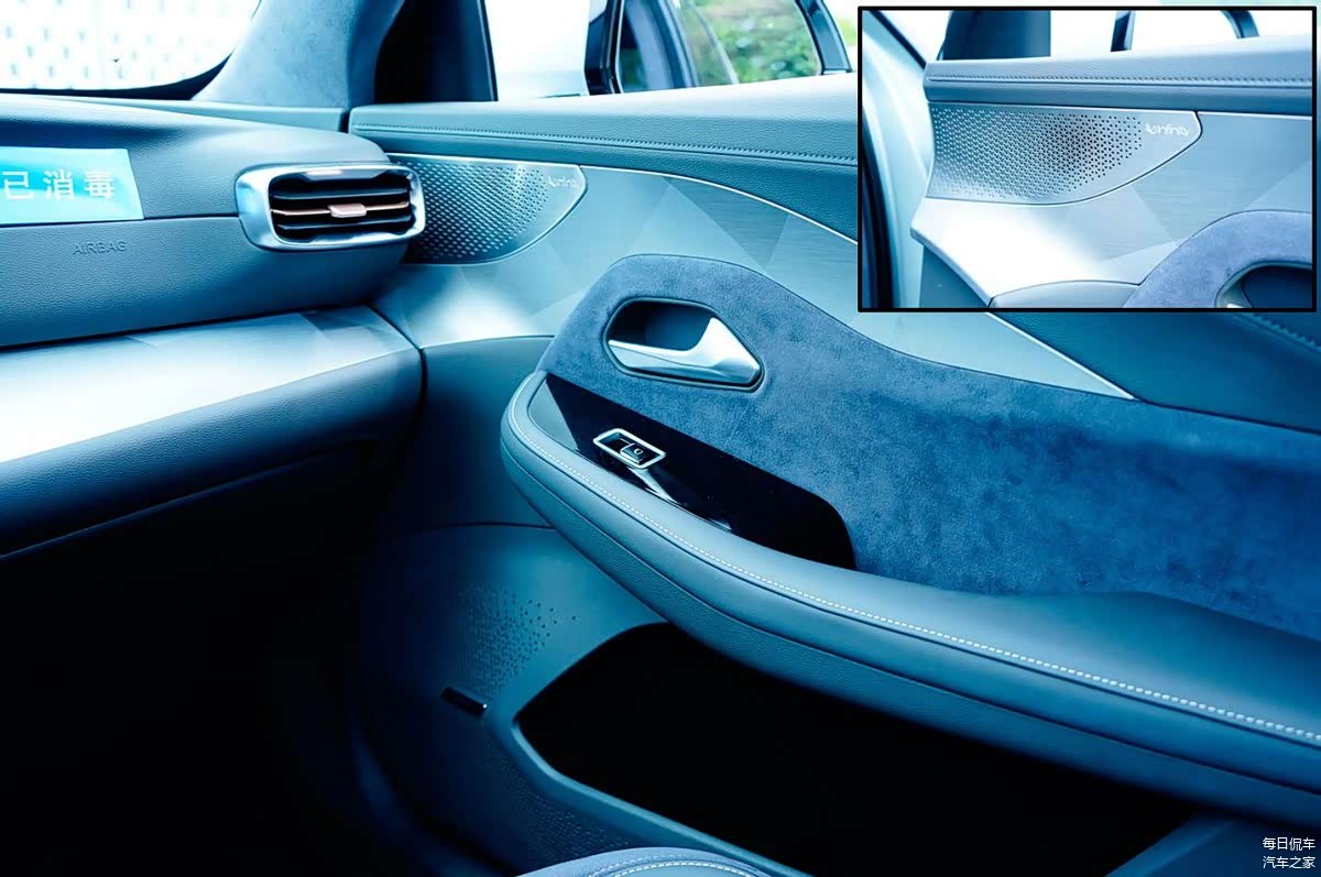 这台车售价超过30万元,车厢的用料达到了应有的水准。副驾驶前台增加了金属拉丝面板装饰,顶部是软性塑胶,车门扶手处由皮质面料和翻毛皮组合,带来舒适的触感。配置了230色车内氛围灯,带来丰富的视觉体验。除入门车型外,都配备有12喇叭的Infinity燕飞利仕音响,全系标配前排隔音玻璃,可以享受到静谧或高质量的声觉体验。