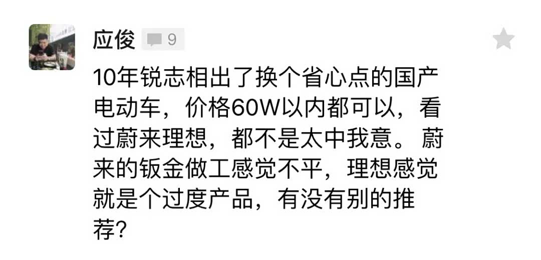 60万预算买国产电车。。。别的先不说,K哥对你的财力和魄力佩服得五体投地。其次,你后面那两句话,我表示非常赞同。