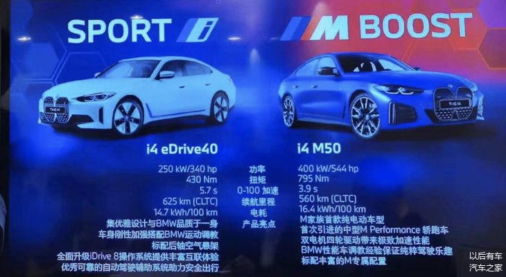 动力方面,新车未来将提供eDrive40车型和M50车型,其分别搭载了最大功率为340马力的单电机布局和544马力的双电机布局,其峰值扭矩分别为430牛·米和795牛·米。0-100公里/小时加速时间分别为5.7秒和3.9秒。续航里程方面,WLTP工况下最大续航里程分别为625km和560km。