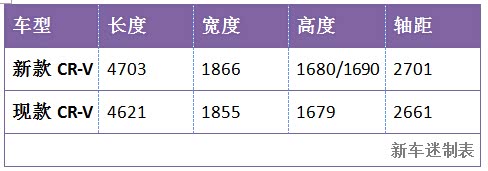 车身尺寸方面,新款本田CR-V 长 4,703 毫米,宽 1,866 毫米,高 1,680 毫米或 1,690 毫米,这使得它比现款CR-V长了82毫米,宽了11毫米,高度基本相同。轴距也增加了 40 毫米至 2,701 毫米,这应该会使车内更宽敞,可能会有七座布局,当然这只是猜测。