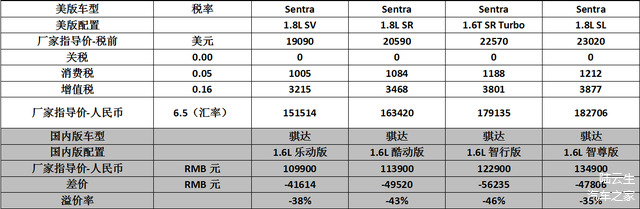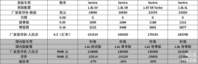 就轩逸来说,是轩逸/蓝鸟/骐达三个车型中溢价率最高的车型。1.6L车型在动力系统简配的情况下,价格比美版低17%。1.8L车型在动力系统与美版一致的情况下,价格比美版低13%。