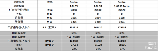 Sentra与蓝鸟价格对比见下表(平均溢价率-24.3%):
