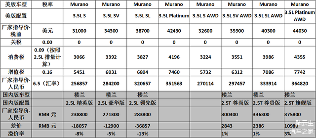 Murano和楼兰的价格对比见下表(平均溢价率-3.5%):