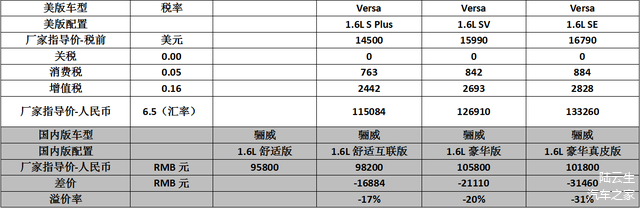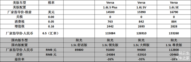 Versa与阳光价格对比见下表(平均溢价率-26%):