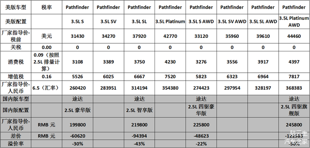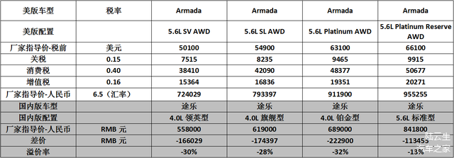 5. 进口车不一定比美版贵,只要厂家愿意,进口车的价格也可以低于美版同款车型。途乐就是最好的例子。作为大型越野车的代表作之一(与红杉同级别)。国内版途乐的价格竟然比美版低了25%,虽然有发动机简配的因素在其中,但是足以说明日产是拿出了足够的决心来和丰田酷路泽竞争的。现在汽车作为一种全球化的商品,经过各个厂家几十年的包装和洗脑,其价格早已脱离了实际的成本,反而和厂家的“定位”关系更大。而厂家对于一款车的“定位”,主要还是取决于一款车的“市场占有率”,为了提高“市场占有率”,厂家是很乐意把定价的25%作为“让利”给消费者的。